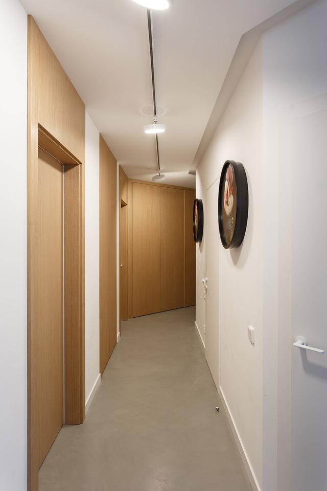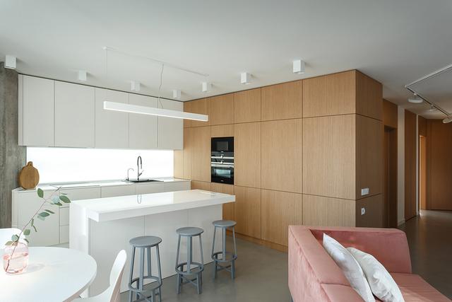 木質效果的櫥柜被放置在白色廚房的一側,以溫暖整個廚房。走廊的內門和周圍都是用匹配的材料完成的,這創造了沿著大廳長度的間隔良好的"條紋"視覺。