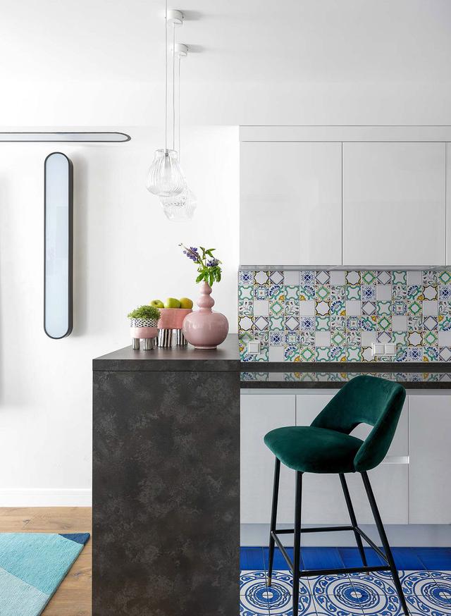 黃色,藍色和藍綠色的圖案瓷磚點綴著新鮮的白色瓷磚,創造了一個色彩豐富但干凈的廚房反濺。這一次,粉紅色的裝飾以淺粉色花瓶的形式出現,再加上一個草本植物花盆和配套的水果盤,讓空間多了幾分活潑的生機。