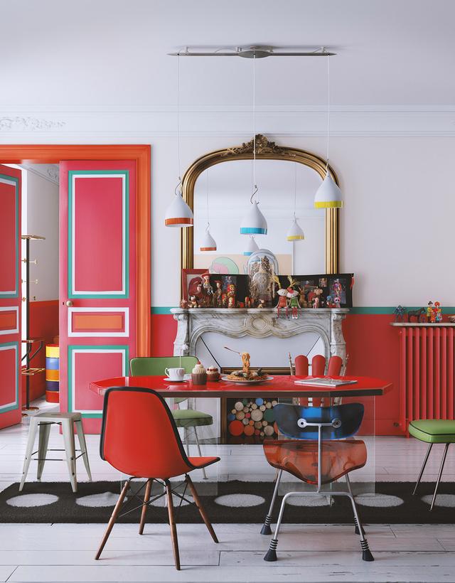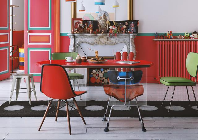 混合搭配的餐椅在紅餐桌周圍形成了一種不同的派對氛圍。