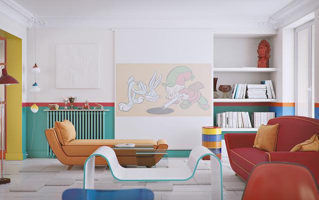 這套公寓的色彩設計簡單,很多類似于兒童的裝飾品和兒童玩具。