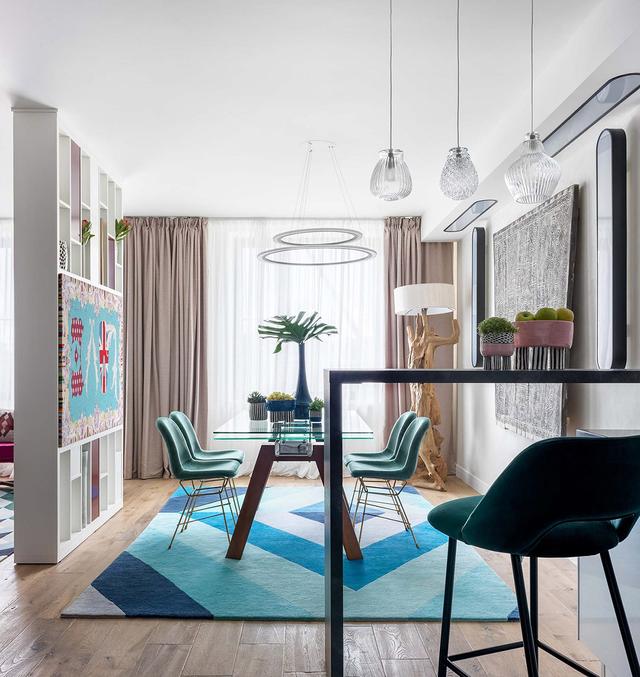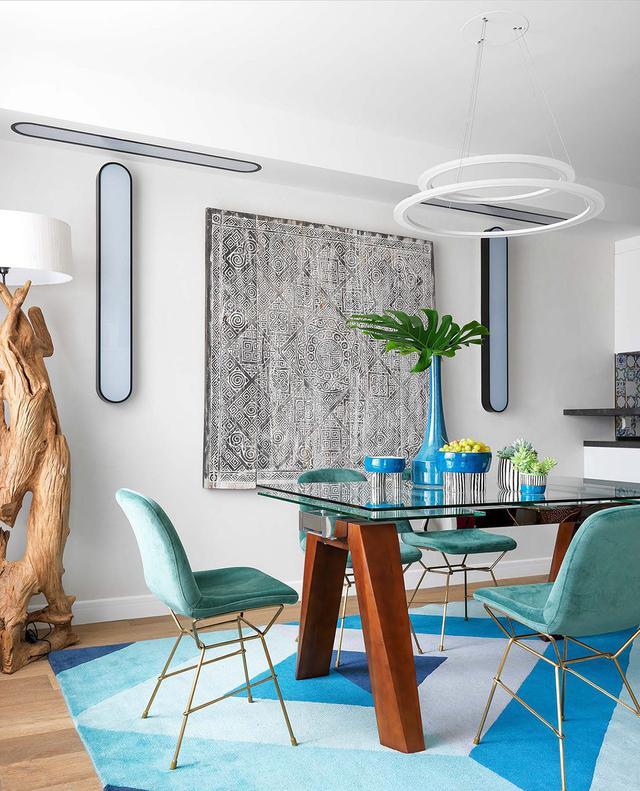 餐廳與帶有早餐吧臺的廚房相連。藍綠色的陰影貫穿始終,并在餐廳桌子下的一個大的幾何風格的地毯。