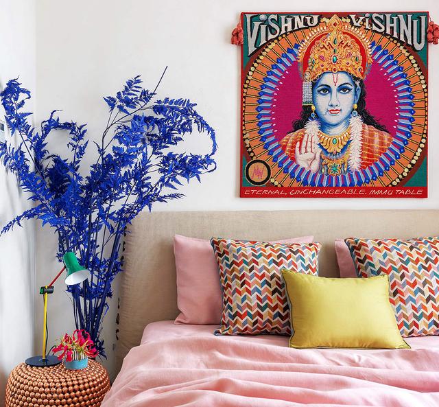 一幅精神藝術品裝飾著床頭的墻壁。一股鈷藍色的浪花把藝術的色彩帶進了房間,床上散落著明亮的靠墊與純色床單。