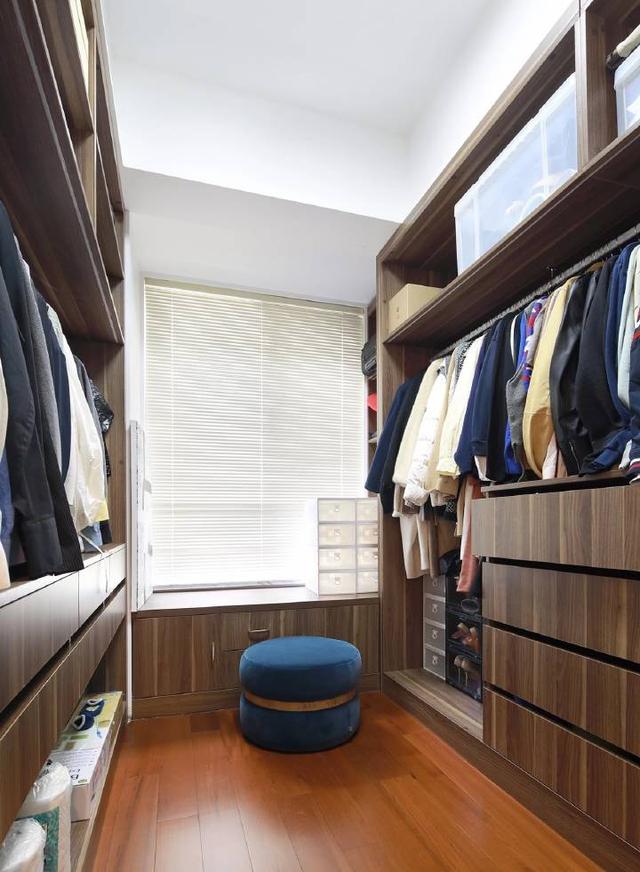 步入衣帽間,可以看到設計不似其余偏向精致的歐式,而是更類似于舒適整潔的日式。溫暖的木制和白色百葉窗相輔形成溫馨感。隔間進行儲物分割形成大小不一的幾何儲物空間,滿足不同類型的衣服鞋子分類歸放。