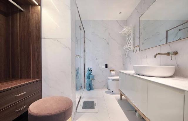 最后看回浴室,因空間優勢,步入其內更顯示出優雅精致感,宛若住進了五星級大酒店。除去推門設計外內部也新分割浴室空間,這可以防止整個空間因沐浴而變得濕漉漉。