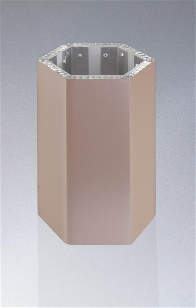 芯材采用六角形3003型鋁蜂窩芯,鋁箔厚度0.04~0.06mm,邊長5~6mm,采用輥壓成型技術完成正、背表皮的成型,全自動機器設備折邊,正、背表皮在安裝邊緊緊咬合。整個加工過程全部在現代化工廠完成,采用熱壓成型技術,因鋁皮和蜂窩間的高熱傳導值,內外鋁皮的熱脹冷縮同步;蜂窩鋁皮上有小孔,使板內氣體可以自由流動;可滑動安裝扣系統在熱脹冷縮時不會引起結構變形,因此可以保證極高的平整度.采用黏結膠:雙組份聚胺酯高溫固化膠,用全自動蜂窩板復合生產設備通過加壓高溫復合而成,克服了以往蜂窩板粘接層的脆性問題。內層為特制的六邊形鋁蜂窩,由硬度達到H19的鋁合金構成,作為粘附在夾層結構中的芯板,在切向上承受壓力。這些相互牽制的密集蜂窩猶如許多小工字梁,可分散承擔來自面板方向的壓力,使板受力均勻,保證了面板在較大面積時仍能保持很高的平整度。