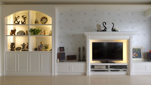 ??? 如果需要增加展示柜的視覺效果,可以在層板前后隱藏簡(jiǎn)介光源,由于是渙散的光線感,壁面地板裝修第一網(wǎng)建議搭配符合房?jī)?nèi)風(fēng)格的壁紙,或是利落的烤漆玻璃,使柜體更有設(shè)計(jì)感。