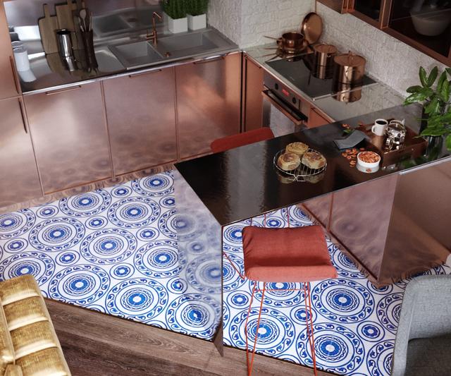 明亮的藍色圓形瓷磚鋪在廚房的地板上。褐色調的廚房凳子與銅櫥柜相得益彰。
