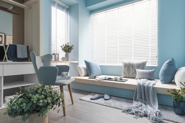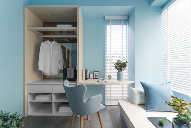 藍色調的椅子放在一張書桌或梳妝臺旁邊,梳妝臺建在一個敞開的衣柜的一側。整個空間中的色調只有藍白綠三色, 營造出一個清新而又充滿活力的書房。