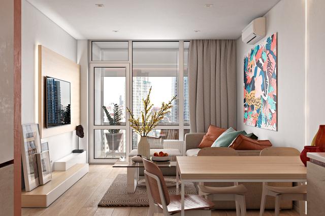 戶型具有非常好的采光條件,一面墻的窗戶讓春天的陽光照入客廳。淺色的灰褐色窗簾聚集在玻璃的一側,使空間顯得更加立體。