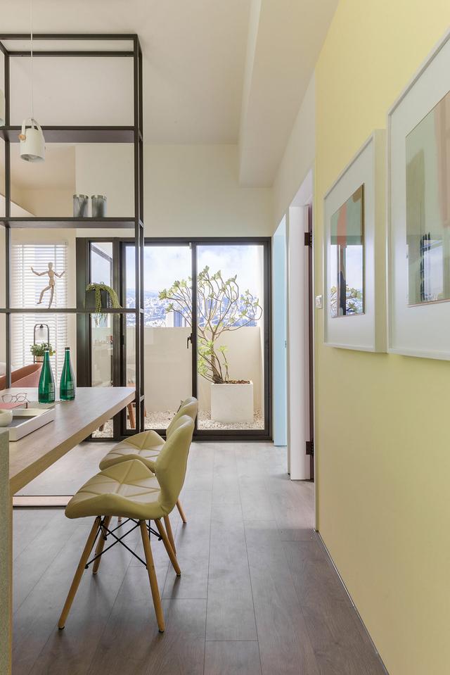 這個公寓空間布局還得益于增加的綠植,通過一個L形的玻璃窗戶,所有的生活區都可以看到綠色。黃色的餐椅在一張木桌的兩邊并排擺放,木桌的一端由一個現代化的擱架支撐。餐廳后面的黃色墻面被涂成了檸檬冰沙的色調。頗有一番青春的感覺!