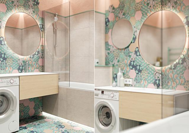 綠松石和橙色六角形瓷磚構成了浴室雜物間內的奇觀。一個極簡抽象派的漂浮梳妝臺和洗衣機后面的墻上是復雜的圖案。與土工切割的瓷磚、圓形梳妝鏡和裝飾性墻壁鏡子形成了曲線美的對比。浴缸后面的瓷磚保持簡單和中性。