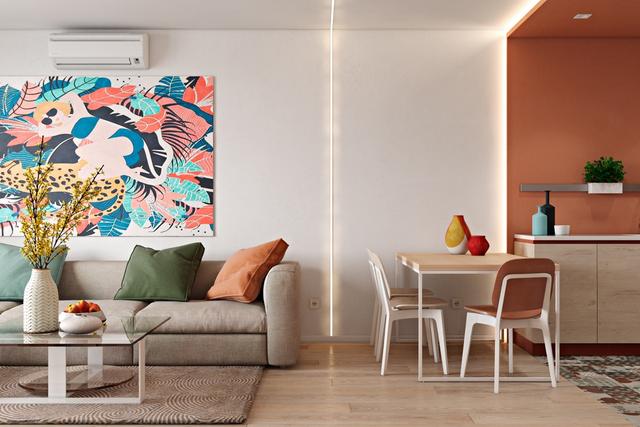 在一間通風的開放式公寓里,以鮮艷的橘色和綠色為主題。