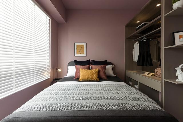 除了藍色主題的書房,這個公寓還有一間粉色主題的臥室。這間粉紅色的臥室甚至有一扇粉紅色的門和一個粉紅色的天花板。墻角一把黃色的椅子打破了打破了粉色的主題。黃色的臥室椅子,床墊和架子小擺設。一盞粉紅色的落地燈與墻壁融為一體。床頭墻壁上的黃色調藝術畫與床上的黃色枕頭、墻角的黃色椅子呼應。與整個空間的粉色調碰撞卻又非常和諧。雙人床占據了臥室狹窄樓層的大部分空間,開放式的壁櫥和儲物架保持了物品的整潔和方便。整個臥室空間看上去明亮溫馨。