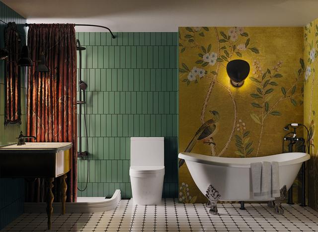 在衛生間,一幅自然靈感的黃色主題壁畫裝飾著浴室的墻壁。整個墻壁用黃色與綠色把空間進行了區分。壁畫上的鳥兒活靈活現,點綴了浴室空間的春天氣息。
