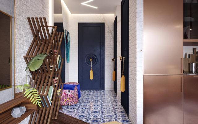 鈷藍色的地磚沿著一條由藍色門組成的走廊向上延伸,金色的門把手上掛著金色的流蘇。這邊是一個木制的交叉置物架,一點綠葉探出給這個空間帶來初春的感覺。