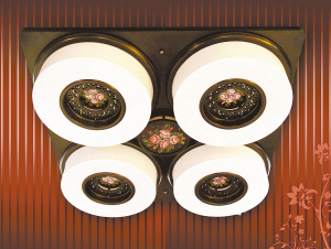 ??? 這款燈飾展現的是“藝彩繽紛”流行趨勢,發現于萬隆匯洋“海菱”燈飾展廳。這款燈在方形整體木框內嵌入4盞圓形羊皮燈,在每個燈罩之間雕刻著一朵朵牡丹花,使其擺脫了中規中矩的傳統形象,變得鮮活起來。