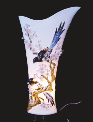 ??? 這款燈飾展現的是“藝彩繽紛”流行趨勢,發現于萬隆匯洋“調光大師”燈飾展廳。陶瓷臺燈上,兩只喜鵲站在梅花枝頭含情脈脈地相互對視,待燈光打開,梅花的淡紅、喜鵲的藍色尾翅活靈活現。將花、草、蟲、魚呈現在設計造型中,燈具就變得藝術起來。