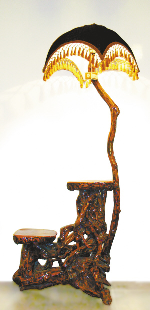 ??? 這款燈飾展現的是“自然風韻”流行趨勢,發現于萬隆匯洋“國風·博藝”燈飾展廳。燈的主材取自山野里的純天然野杜鵑根,根據其自然形成的形狀應勢發揮,雕琢成既有高低兩個平凳又夾帶著一根長柱的多功能燈架,顯示出自然的魅力。