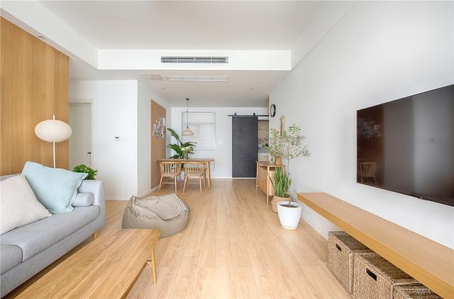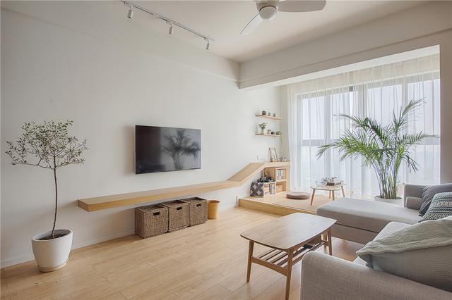 客廳電視墻的設計也是充滿了創意感,這樣壁掛式安裝的一字格隔板的電視墻,直接延伸到了陽臺空間,陽臺為了方便使用打造一個榻榻米的臺面,這樣的設計方式不僅看著有創意,而且也很簡約富有文藝感,提高了客廳的顏值。