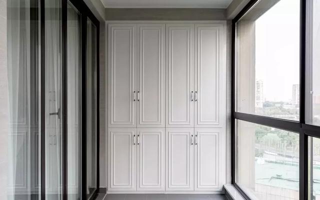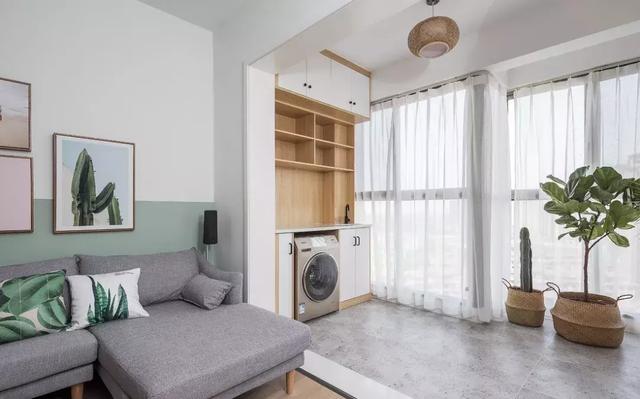 1萬多1㎡的陽臺,只拿來洗衣晾曬,那就太心痛了??梢栽谙匆鹿裆线叴虻豕?,或者直接做整面墻柜子,不常用的東西如行李箱,可以放在這里,為家里騰出活動空間。
