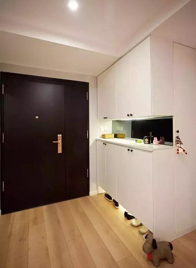 玄關柜做得好,基本上家里一半的東西都收納進去了,建議大家做成嵌入式及頂天立地式的,這樣子不占用建筑面積,還不用擔心頂部積灰。
