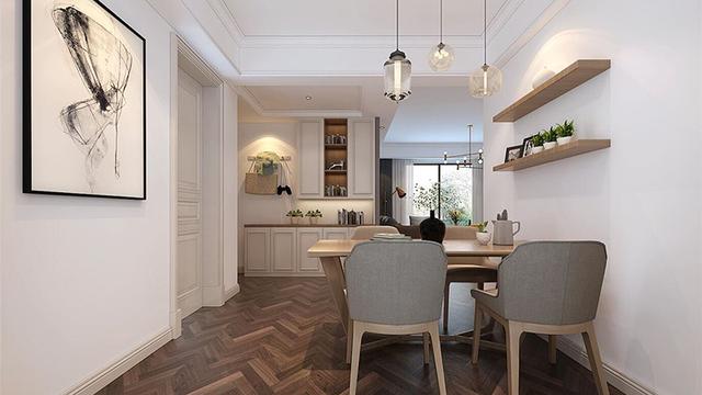 餐廳裝修的也是很簡單富有儀式感,雖然墻壁直接是重新刷新,但是看起來卻顯得很嶄新,搭配的是北歐風實木餐桌椅,個性的抽象壁畫和隔板進行墻壁裝飾點綴,玻璃吊燈的安裝起到燈光照明的作用,餐廳裝的十分時尚簡約大氣。