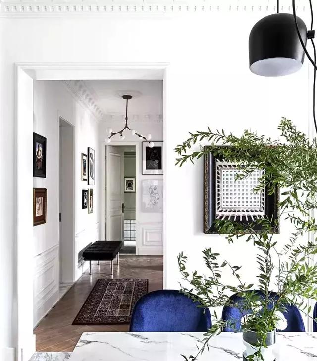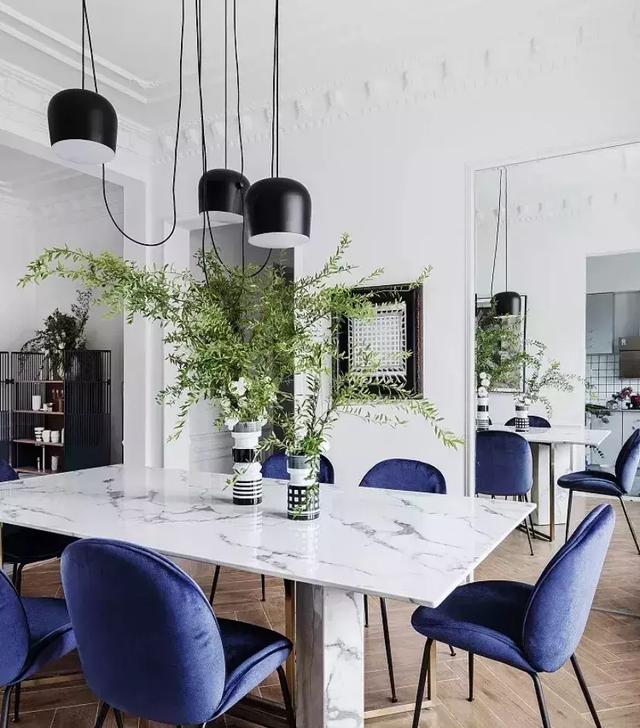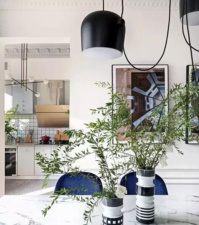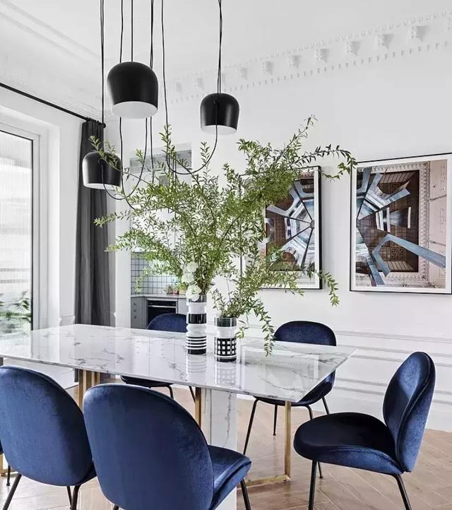簡約大理石臺面餐桌灰白有序,簡歐式吊燈和綠植格外有情調。
