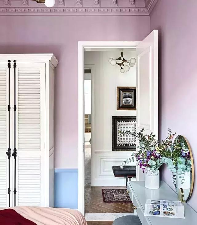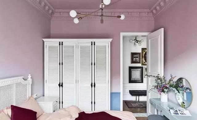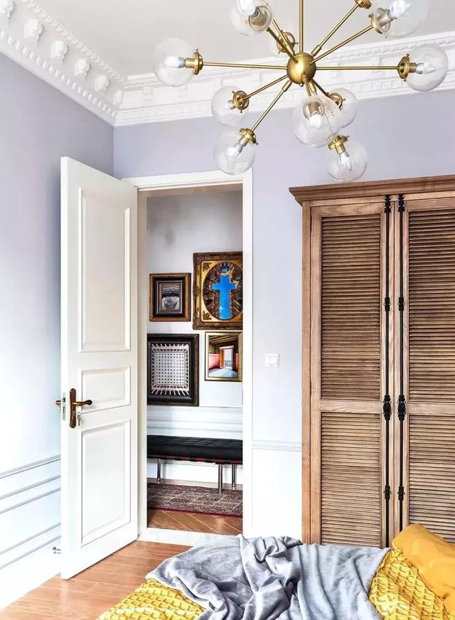 次臥也可以作為老人房,所以需要考慮適當的舒適性和年代感,但是在色彩的選擇上,運用了時尚紫搭配拉絲金,讓原本傳統的老人房,增添了一些時尚感,過道的畫墻,也為空間增加了一份故事性,一個有回憶的長輩房誕生了。