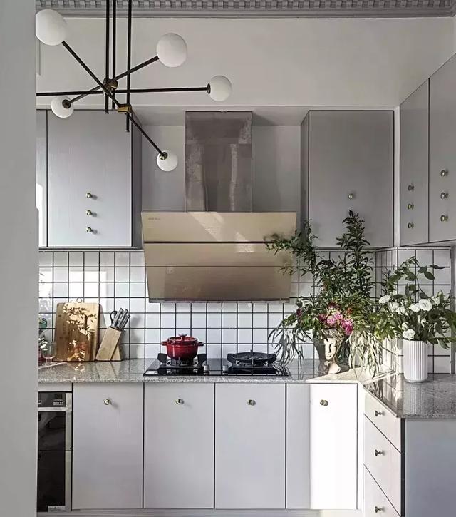 廚房空間采光十足,硬裝這次最大的重頭戲,是把常規廚房頂上,用來預埋煙道線管的區域(大概從頂吊下來400mm),全部做在了吊柜以上的墻面區域(如圖吊柜以上的白色區域),保留了層高,又未占任何儲物功能,色彩上,保留了墻面的白色,反常規地將頂面做漆,增加了空間的精致感及耐臟性。
