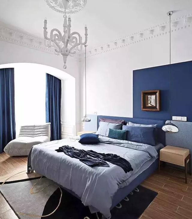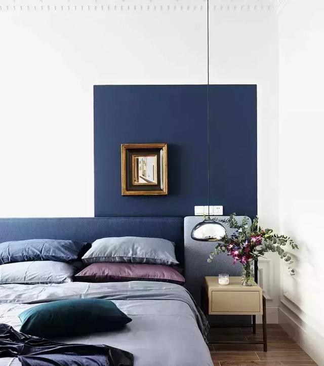 藍色和白色隔開臥室背景墻,瞬間讓空間增添了藝術氣氛。