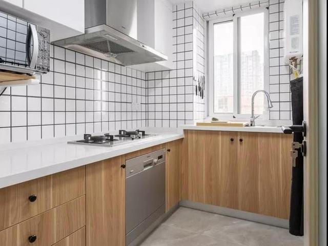 原木色的櫥柜呈L型擺放,與白色的墻壁很好的搭配在一起,顯得非常清新自然,也將廚房的空間很好的使用了起來,極大的拓寬了操作臺(tái)的面積,日常做飯顯得更加寬敞一些,在吊柜下面還安裝了置物架,將廚房的小電器很好的放在上面。