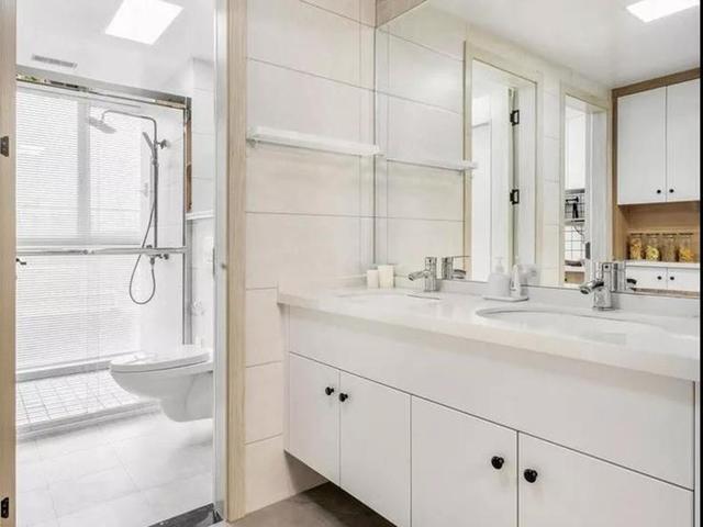 白色的浴柜放在了衛(wèi)生間的外面,采用壁掛的安裝方式,顯得非常精致漂亮,搭配一面大尺寸的鏡子,把這里映襯得更加敞亮,在日常生活中使用起來更加方便一些,衛(wèi)生間里面墻壁采用白色的瓷磚,既好看又能起到非常好的防潮效果。