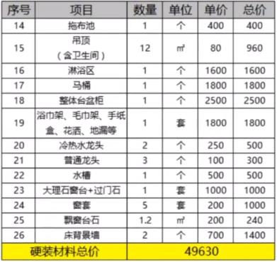 第二部分就是一些硬裝家居材料了,像馬桶、水龍頭、水槽、窗臺等,這部分的花費比較少,只占了硬裝總費用的四分之一左右,整個硬裝部分價格不到5萬。