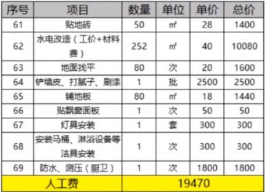 這個主要是地面、墻面、包括陽臺的一些硬裝施工,只有地板和門花費的比較多,其他的一些材料,中規中矩,價錢也算正常吧!