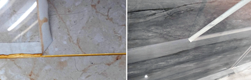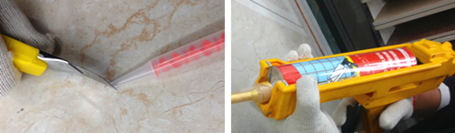 選擇設計顏色的靚縫劑并檢測材料真偽、保質期,保證材料符合標準。安裝專業優質省力膠槍擠壓去除前端20cm靚縫劑,使靚縫劑AB組分充分混合均勻即可,然后將AB組分混合出料嘴安裝至出料口。