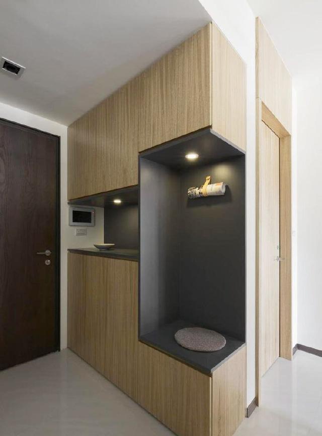 把柜子嵌入墻體,不占面積,節省空間,底部兩層開放隔板設計,放置居家拖鞋和經常出門穿的鞋子非常合適。頂部的吊燈散發出柔和的光線,讓人一進門就倍感溫馨。