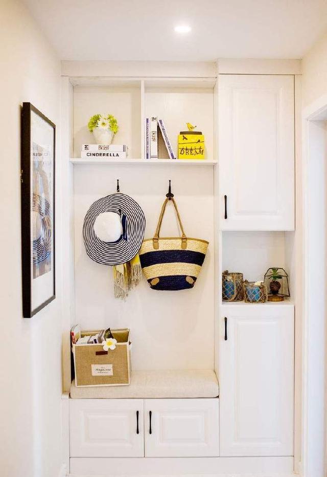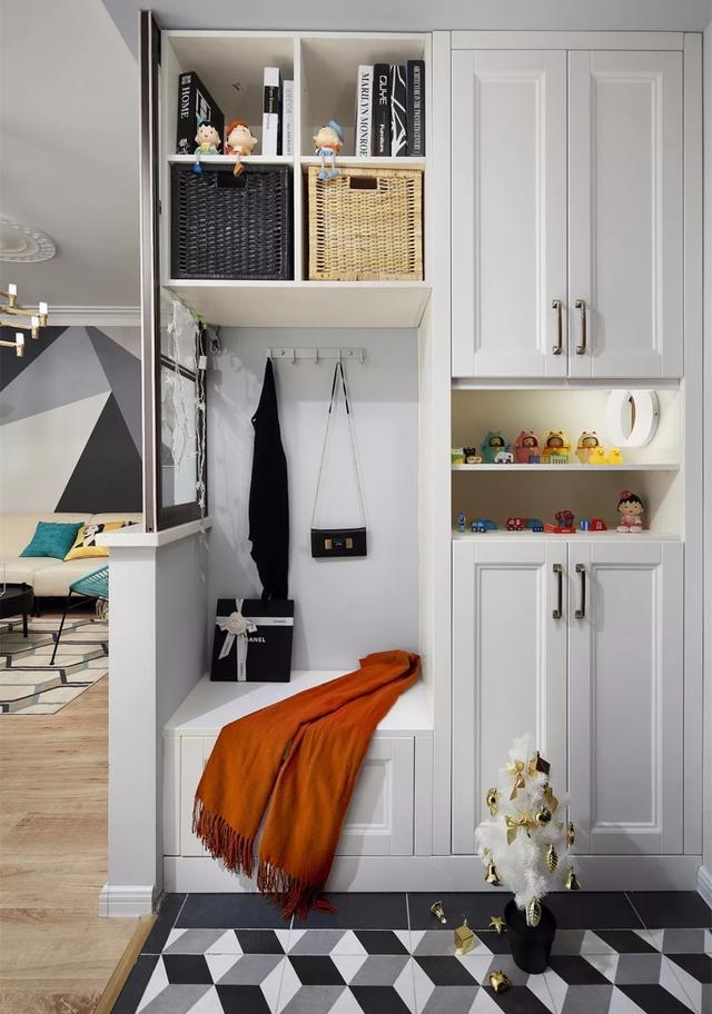 地面設計成幾何圖形的花磚,既耐臟又能進行功能劃分,把換鞋凳打造成卡座式,既能坐著換鞋又能作為收納,鞋凳上方掛鉤可以掛包包衣服,開發式柜子可以擺放書籍或者小工藝品作為展示,美觀實用。