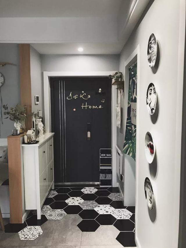 六角地磚成為居室一道美麗的風景線,不規則排列,非常有個性。一個簡單的鞋柜,不占空間,滿足日常需求也足夠了。