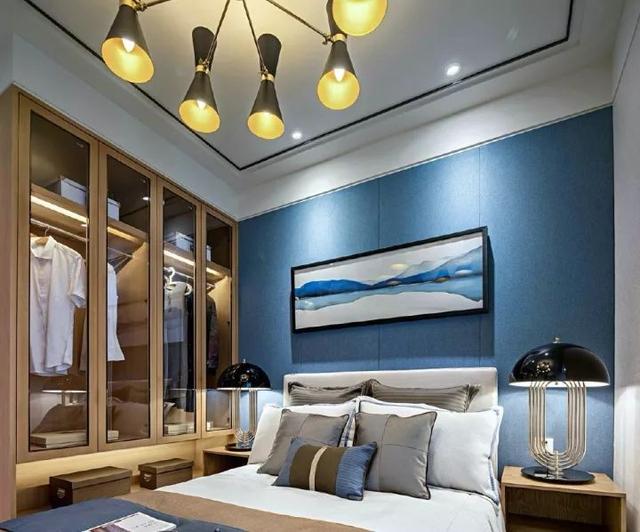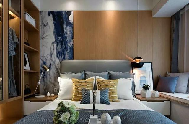 臥室與客廳配色相似,都用木色+藍色,有一種靜謐而優(yōu)雅的味道。