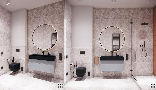 浴室覆蓋著蒼白的花崗巖石板。單色梳妝臺單元從黑色盆頂過渡到下面存儲空間的灰色陰影。一面圓形梳妝鏡的邊緣被照亮。黑色的壁掛式馬桶與黑色的面盆很相配,黑色的浴室配件、固定裝置和配件也是如此。