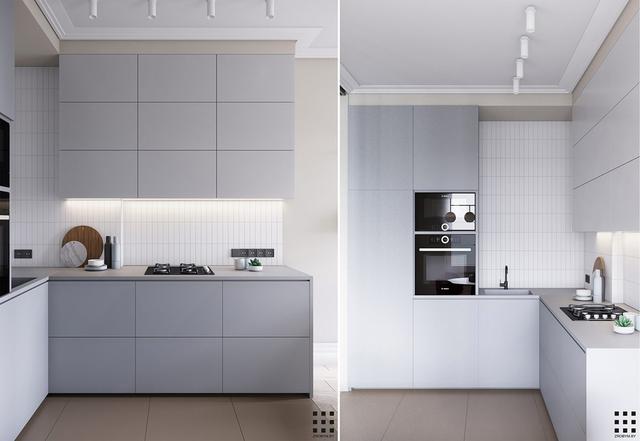 這個小廚房里有很多櫥柜。三排壁柜沿l型的一面走,全高單元占據另一面。圓形砧板擱在工作臺上。