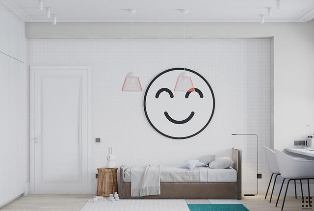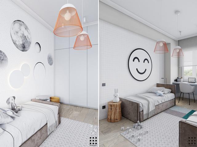 在這個極簡主義風格的孩子的臥室里,笑臉迎面而來。這里的兩個孩子的床沿著墻擺放在中心位置,為一個雙書房區域讓路。銅色的燈光為白色為主的房間裝飾帶來了溫暖的色調。