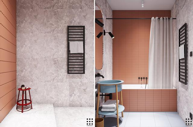 套間主浴室的淋浴墻上貼著銅色瓷磚,一個紅色的小凳子把洗漱用品放在手邊。黑色的加熱毛巾架、面盆和淋浴頭帶來了基調。
