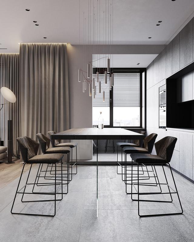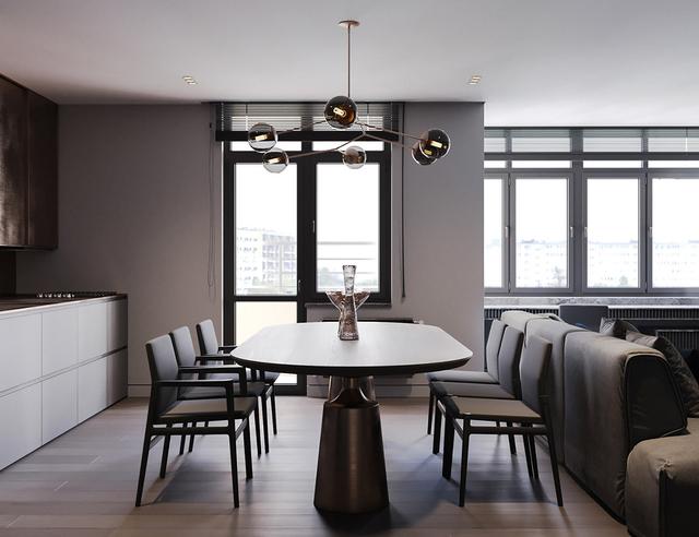 餐廳里有一種中世紀(jì)的現(xiàn)代氣息。一個(gè)很酷的人造衛(wèi)星枝形吊燈懸掛在一張橢圓桌子和六把智能椅子的上方。