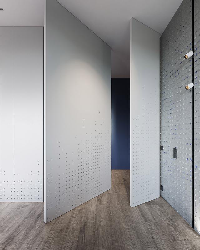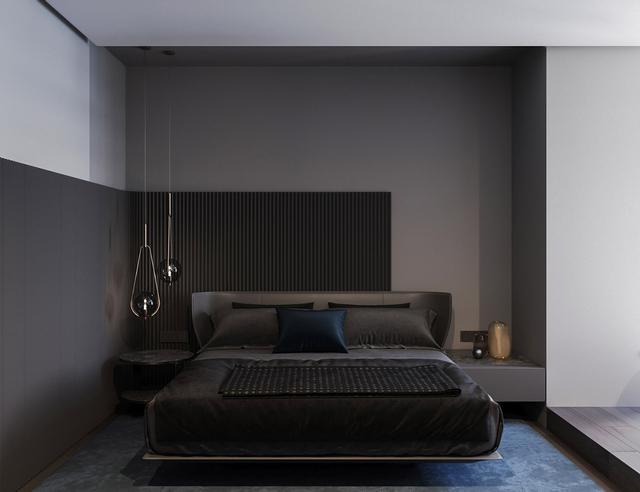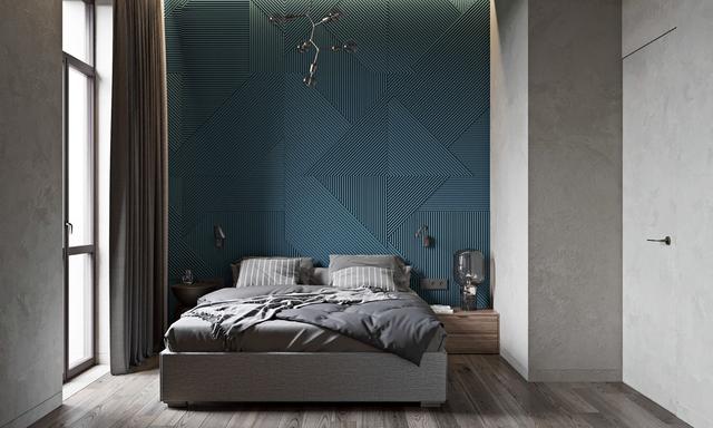 藍(lán)色臥室設(shè)計(jì)特點(diǎn)是有紋理的床頭墻。肋板被切割和連鎖在重音墻形成幾何圖案。