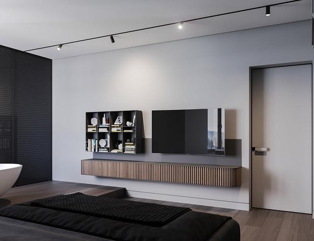 一個(gè)掛鐘安裝在媒體單元的上方,媒體單元從電視墻上走下來(lái)。壁掛式書(shū)架占據(jù)了另一端。