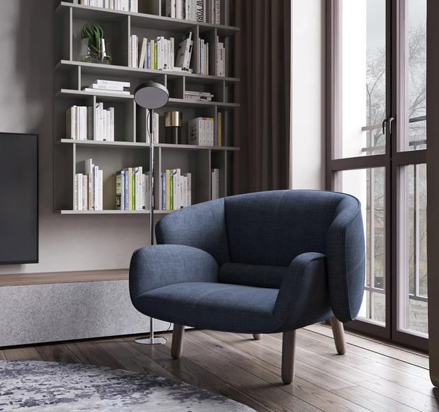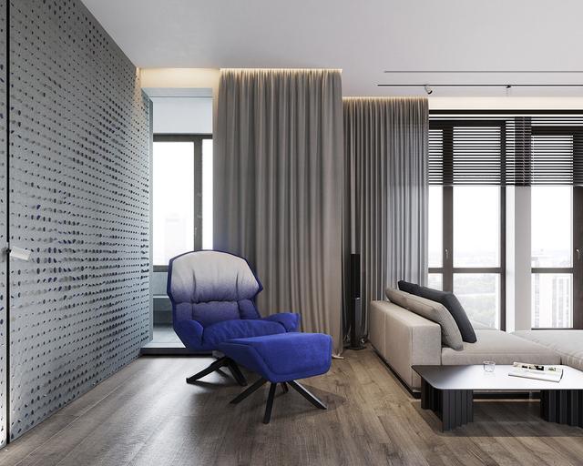 沙發(fā)對(duì)面放著一把藍(lán)色的椅子,沙發(fā)上有一個(gè)藍(lán)色舒適的靠墊,以保持顏色主題的一致性。