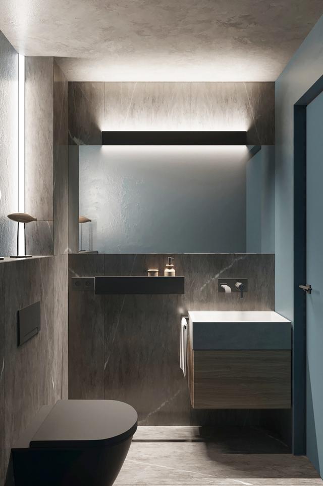 一個(gè)整潔的化妝室配有一個(gè)極簡(jiǎn)主義的洗漱用品架,一個(gè)獨(dú)特的浴室水槽,和一個(gè)現(xiàn)代的灰色廁所。