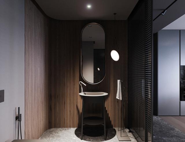 就在廚房旁邊,有一間玻璃墻浴室,里面有一個(gè)獨(dú)立的基座水槽和一面橢圓形梳妝鏡,與一面木板墻形成了美麗的搭配。