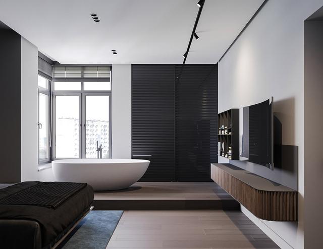 臥室設(shè)有一個(gè)獨(dú)立的浴缸靠窗,通過(guò)窗戶可以俯瞰整個(gè)城市。